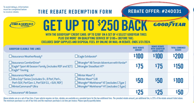 To redeem your rebate, purchase a set of four rebate-eligible tires and keep your receipt. Have your rebate offer number, name, address, and phone number ready. Goodyear privacy policies apply. Submit your rebate by mailing the completed form with your receipt or redeeming it online through one of our Rebate Centers. Ensure all details are accurate for a speedy and smooth process.