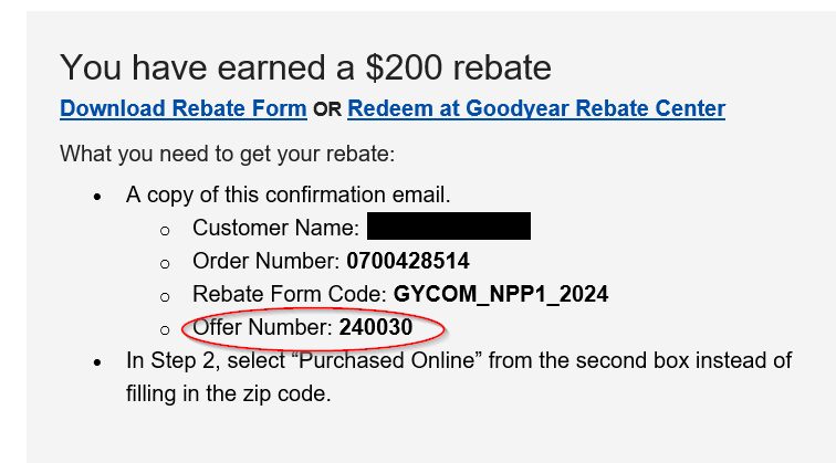 For Goodyear.com purchases, you can find the offer number in your confirmation email: